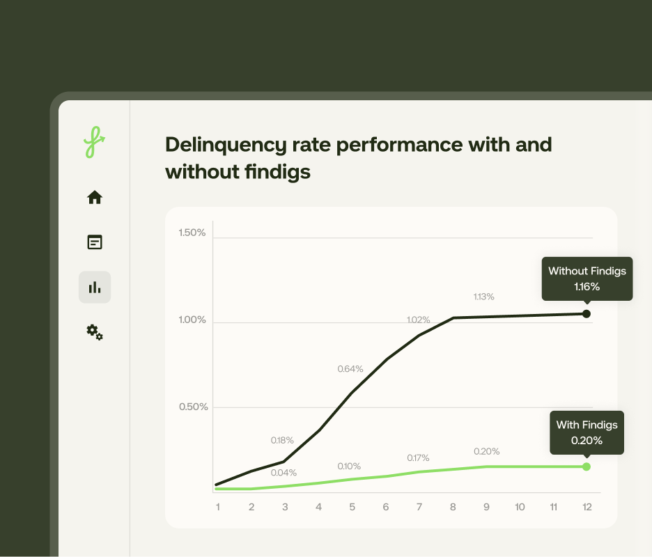 Findigs is your single source of truth for screening criteria. This allows you to make effortless changes based on the data in Findigs around velocity, occupancy, and delinquencies and to continuously evaluate the success of your criteria over time.